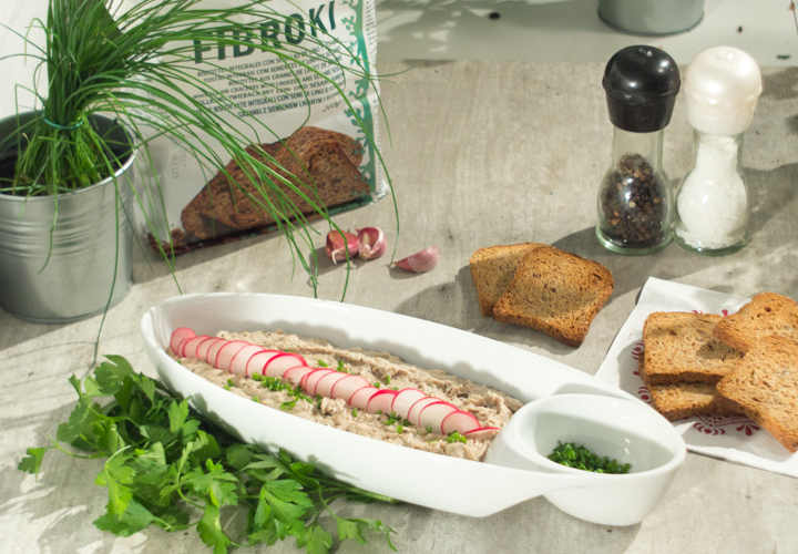 Ugotowane jajka rozgnieść widelcem, wymieszać z odcedzonym i rozdrobnionym tu...