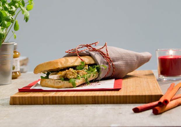 Ciabattę zgrillować z obu stron, posmarować serkiem. Nałożyć po kolei: ruk...