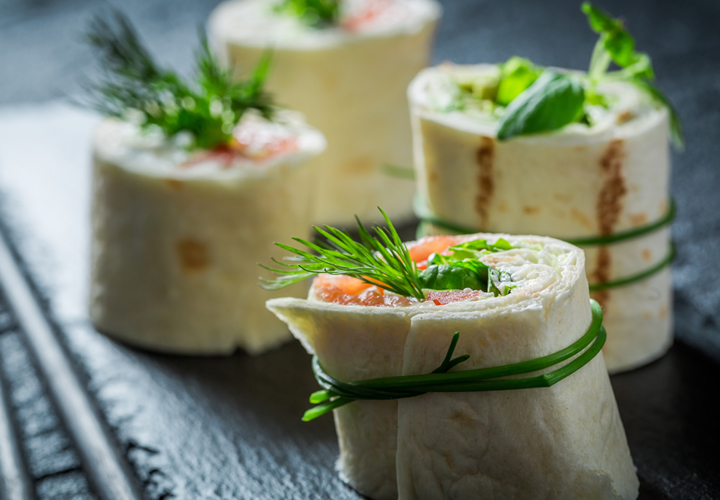 Tortillę posmarować białym serkiem, posypać rukolą, wyłożyć wędzonego ...